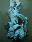 My deep interest in the masters such as Goya, Velasquez, Rembrandt and Bacon is echoed in their handling of the stuff of paint, the description of the subject is a joy to see when the medium becomes one and the same as the observation. These issues constantly pre occupy my mind whilst painting. It is never enough to see colour sitting on the canvas in a passive way, it has to move, illuminate and intrude our physical space. Only when this has been satisfied and on close inspection, should we see the subject emerge from the canvas.